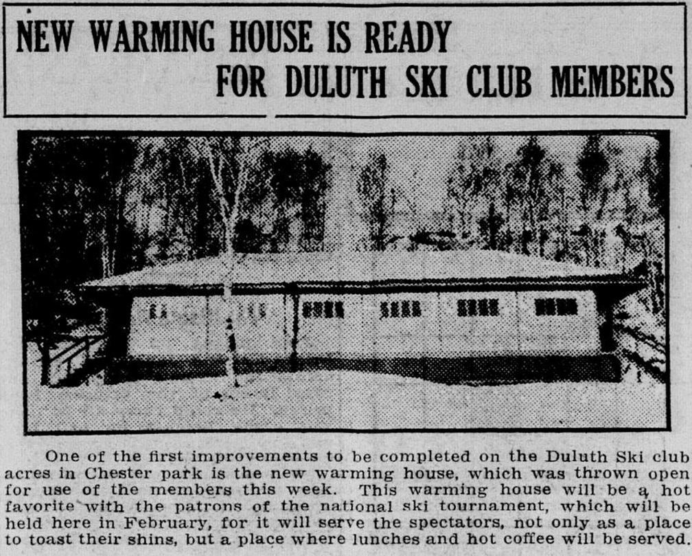 The Jan. 2, 1926 Duluth Herald reported on the recent opening of a warming house at Chester Park, one month ahead of the national ski tournament held there. A new chalet was built at the ski hill in 1972. It was named the Thom Storm Chalet following Storm’s 2015 retirement as Chester Bowl’s director. An expansion and renovation project for that chalet is planned for later this year.