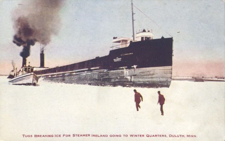 This undated postcard, circa 1903 to 1913, shows a tugboat next to the Steamer R. L. Ireland, which the caption indicates is “going to winter quarters, Duluth, Minn.” The Great Lakes bulk freighter was built and launched in 1903. According to the website Great Lakes Vessel History, it was twice renamed — Sirius in 1913 and Ontadoc in 1926 — and sold for scrap in 1970.
