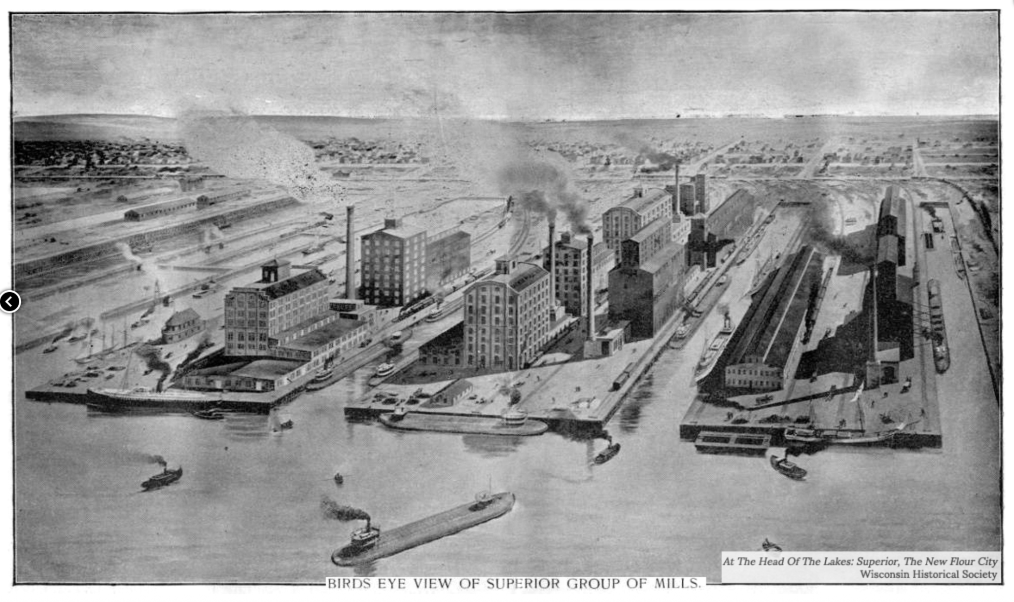 By the early twentieth century, these piers were incredible sites of commerce. Superior was in competition with the Minneapolis area as the center of wheat and grain production, and several major companies built grain elevators and mills on the piers — Lake Superior Mills, Anchor, Listman, Cargill, and Belt Line. Most of these structures were destroyed in fires.