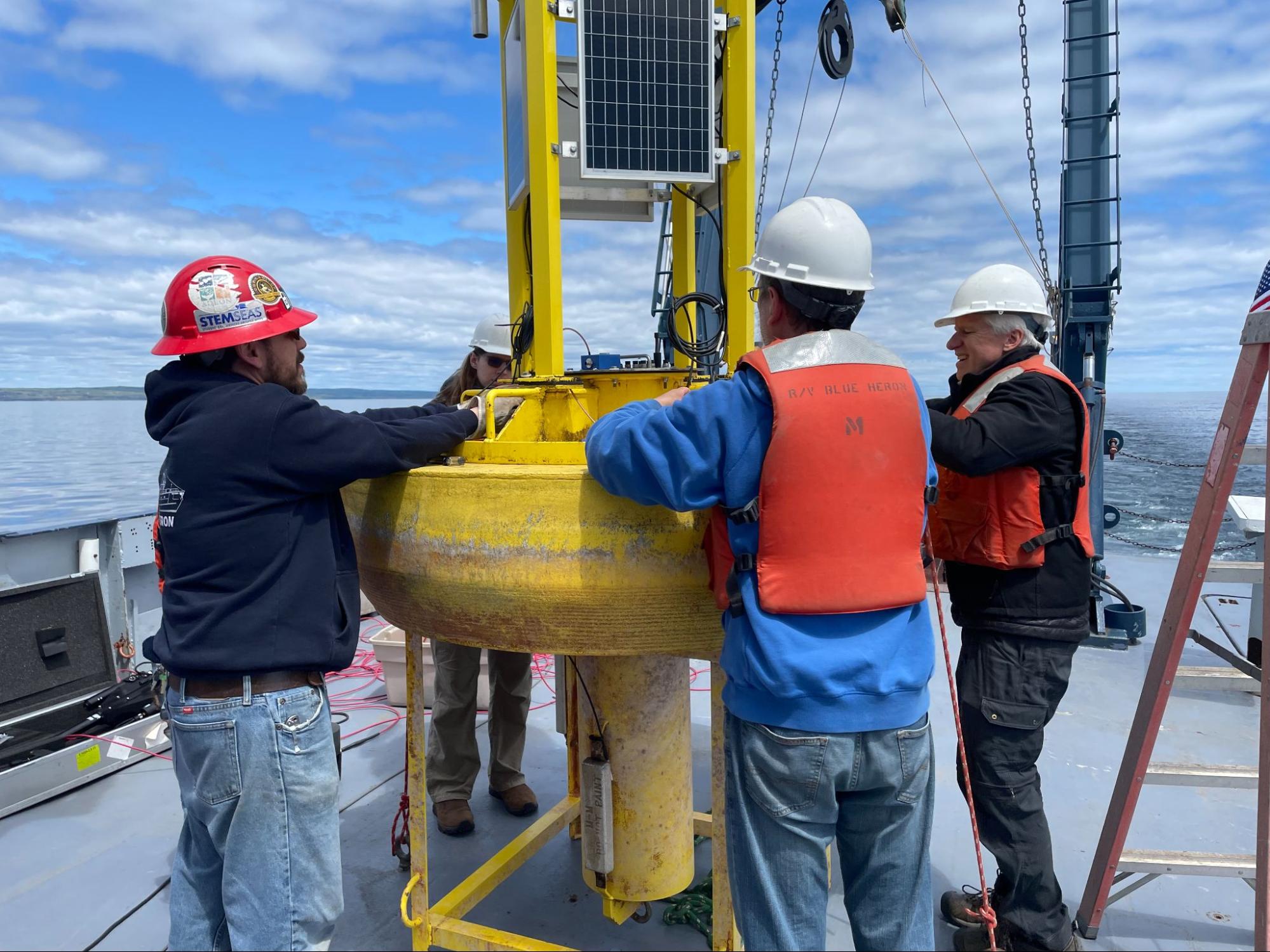 The crew of the Blue Heron lowers a high-tech buoy from Lake Superior onto the deck of the ship for an inspection. (Photo by David Beard).