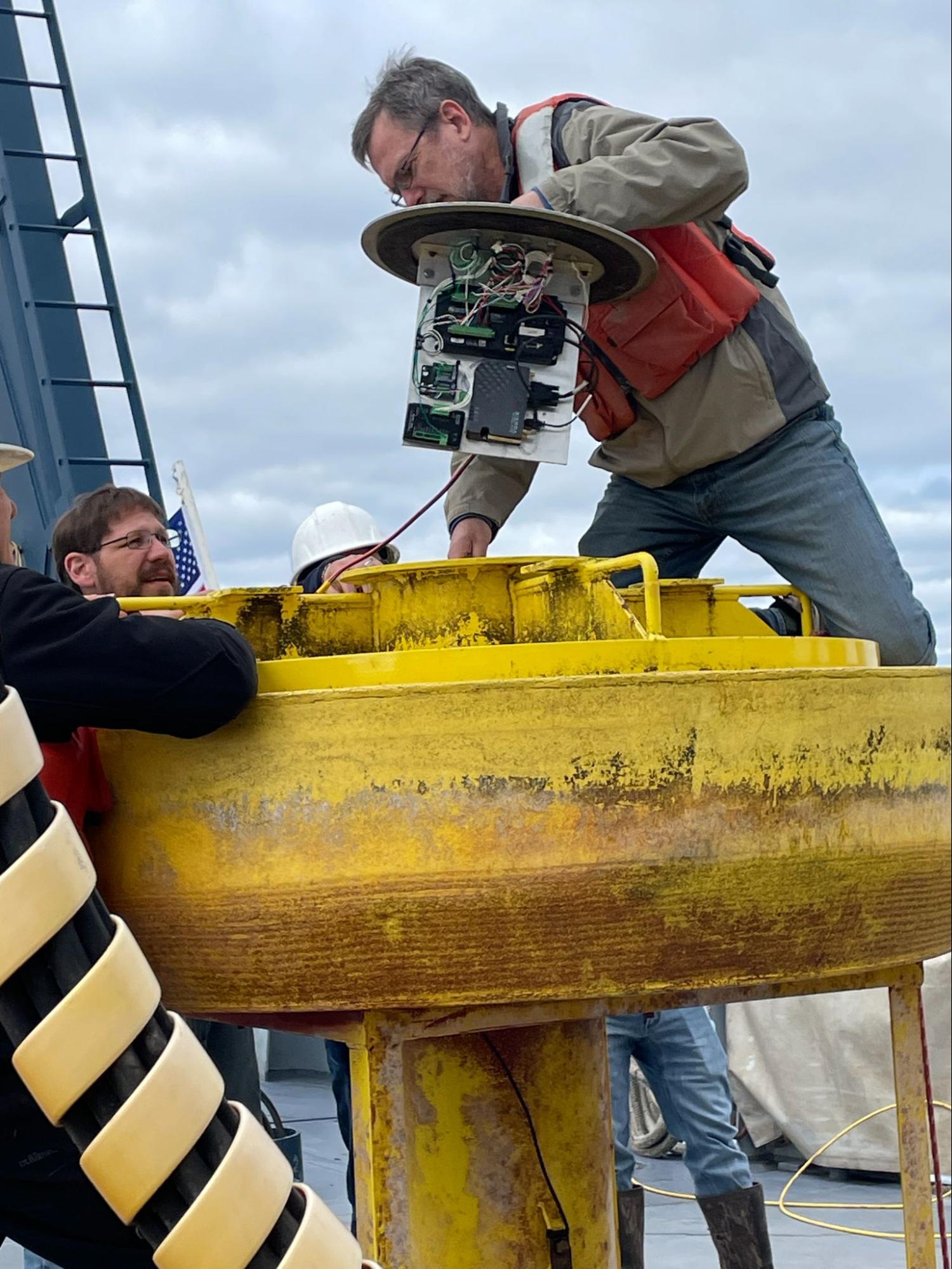 Jay Austin aboard the Blue Heron, Summer 2025, removing the high technology inner workings of a buoy designed to monitor weather and water in Lake Superior. (Photo by David Beard)
