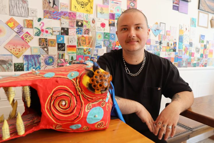 Atlas posing at Studio Cafe with one of his puppet heads. Photo by Jess Morgan.