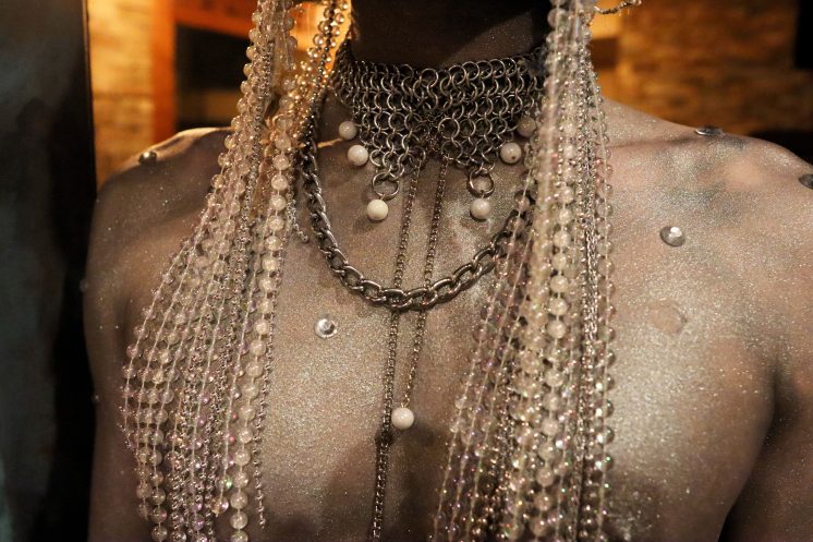 A chain mail necklace made by Emma Warmanen, worn at the Dollhaus event at The Main Club on June 21. The headpiece worn by the model was created by Cherry Koch. (Photo by Jess Morgan)