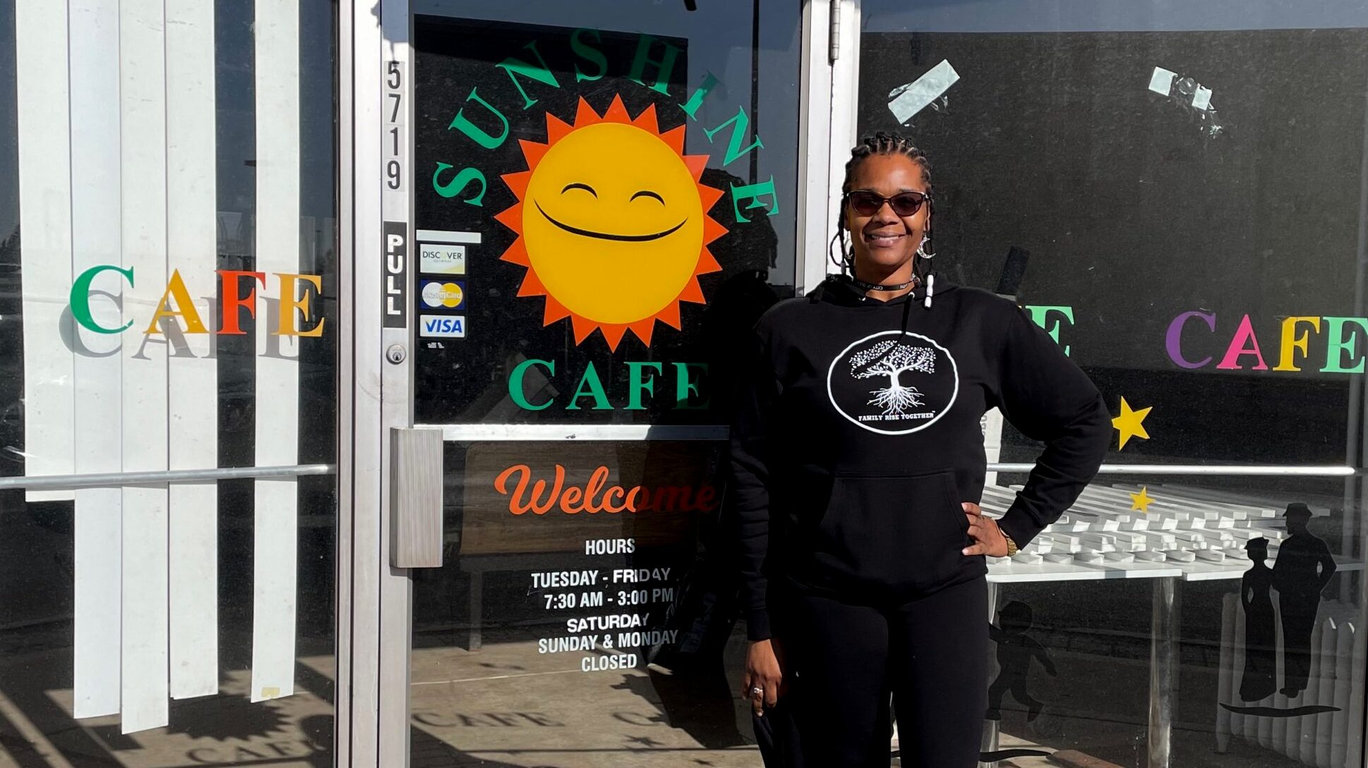Family Rise Together Executive Director ChaQuana McEntyre stands outside the Sunshine Cafe, 5719 Grand Ave. The social service organization purchased the diner and will remodel it to serve as a food-service industry small-business incubator. (Photo by Lissa Maki)