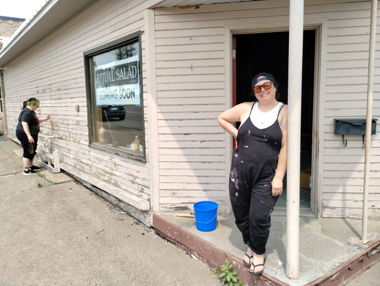 Ritual Salad owner Cori Zastera poses in the doorway of her new restaurant location in Lakeside. Zastera and friend Jenna Wersal, left, were prepping the building for paint June 11. (Photo by Mark Nicklawske)