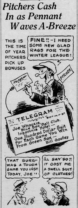 Columnist Al Demaree defended the practice of offering to buy a pitcher a new overcoat if he beat a rival team, as the promise of a new suit of clothes “can give the pitcher that extra, subconscious mental incentive to win that is sometimes the only difference between victory and defeat.”
