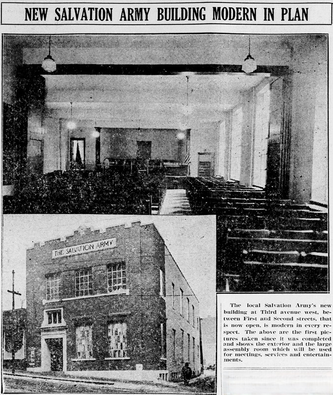 The local Salvation Army’s new building at Third avenue west, between First and Second streets, that is now open, is modern in every respect. The above are the first pictures taken since it was completed and shows the exterior and the large assembly room which will be used for meetings, services and entertainments.
