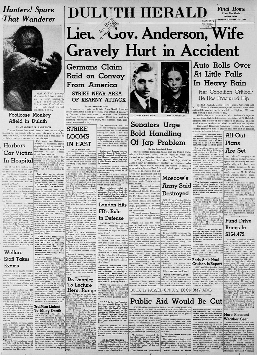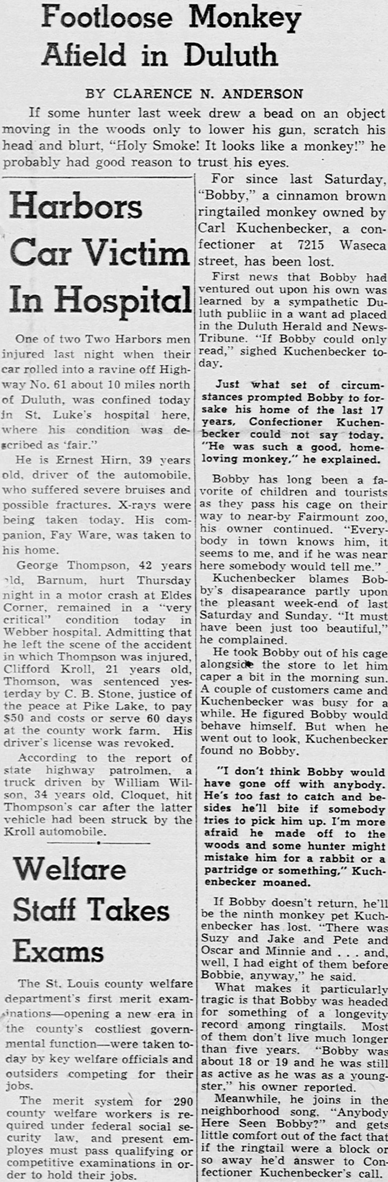 Carl Kuchenbecker was apparently responsible for nine primates disappearing into the woods near Kingsbury Creek during his many years as proprietor of The Same Old Place in West Duluth. The story of a “ringtailed monkey” named Bobby landed on the front page of the Duluth Herald on Oct. 18, 1941.