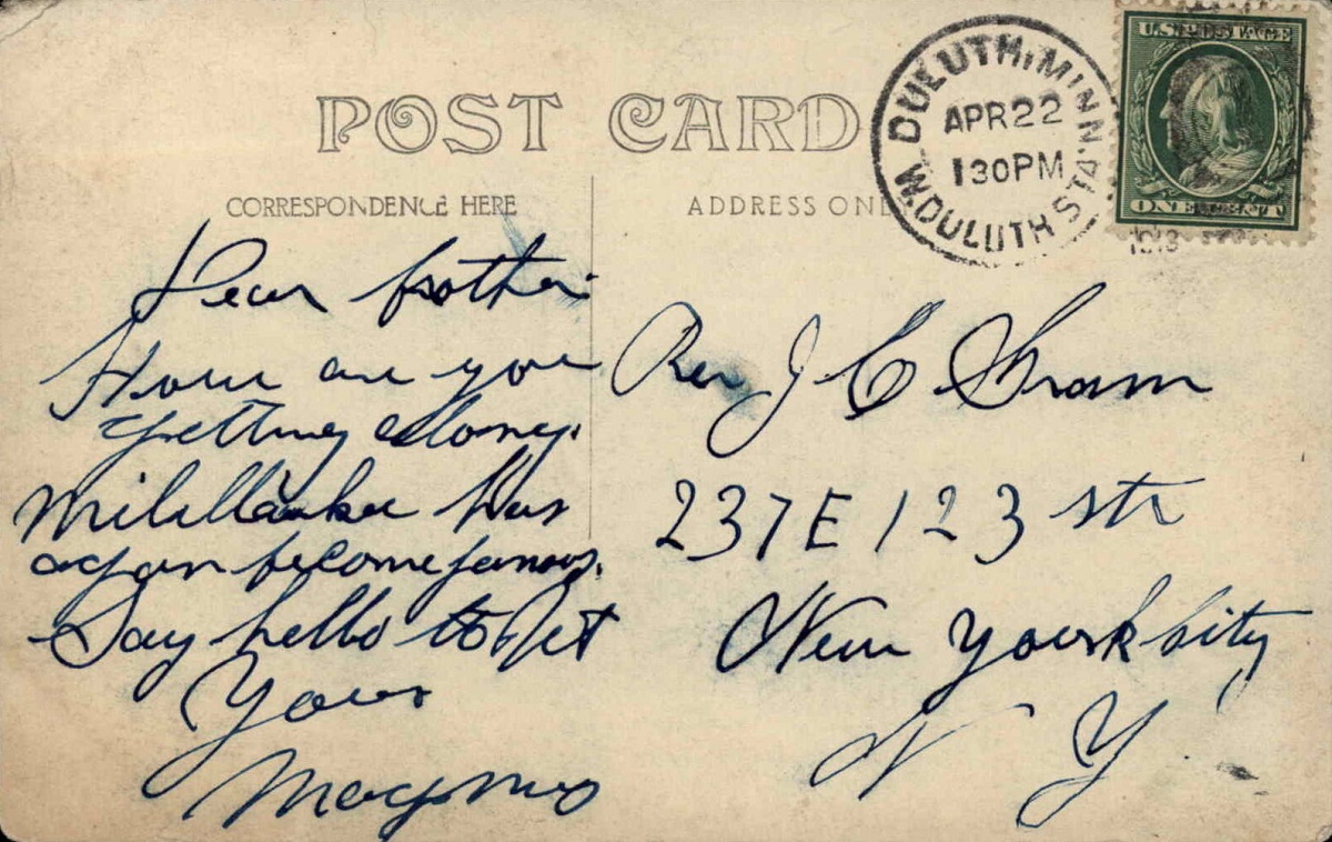 That article led to others, all in Norwegian. The recipient of the postcard, Reverend J.C. Gram, seems to have been a Lutheran pastor who worked around rural parts of Northeast Minnesota before finding himself in Manhattan. Although the Norwegian newspaper articles only discuss his congregations in small Minnesota settlements like Akely and Buzzle, he must have spent some time in the city because his sibling wasn’t the only one sending the family postcards from West Duluth.