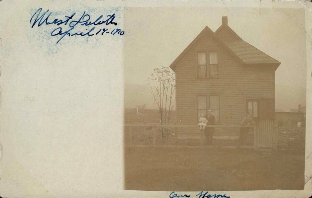 This photo is dated April 19, 1910 — 115 years ago today. It shows a house with two adults standing against a wooden fence and a child sitting on the fence. The image is from a postcard with writing indicating the house was in West Duluth.