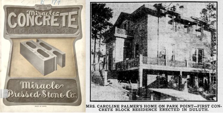 Left: Cover of the 1908 catalogue for the Miracle Pressed Stone Company of Minneapolis; Right: The first hollow concrete-block house in Duluth. (Sources: The Minnesota Digital Library; The Duluth Evening Herald, Feb. 3, 1906)