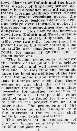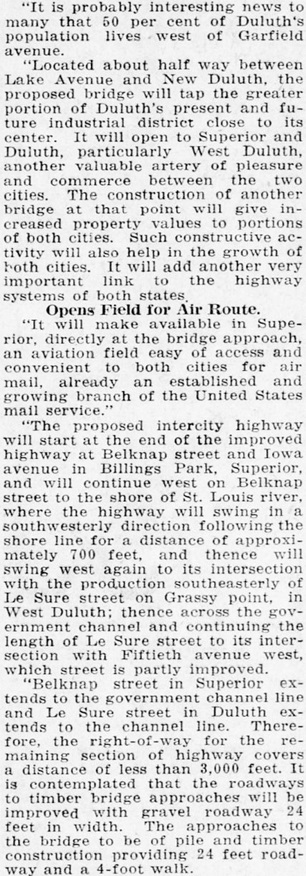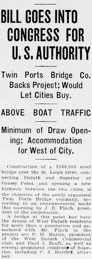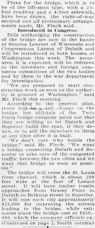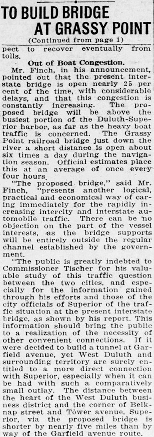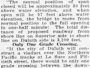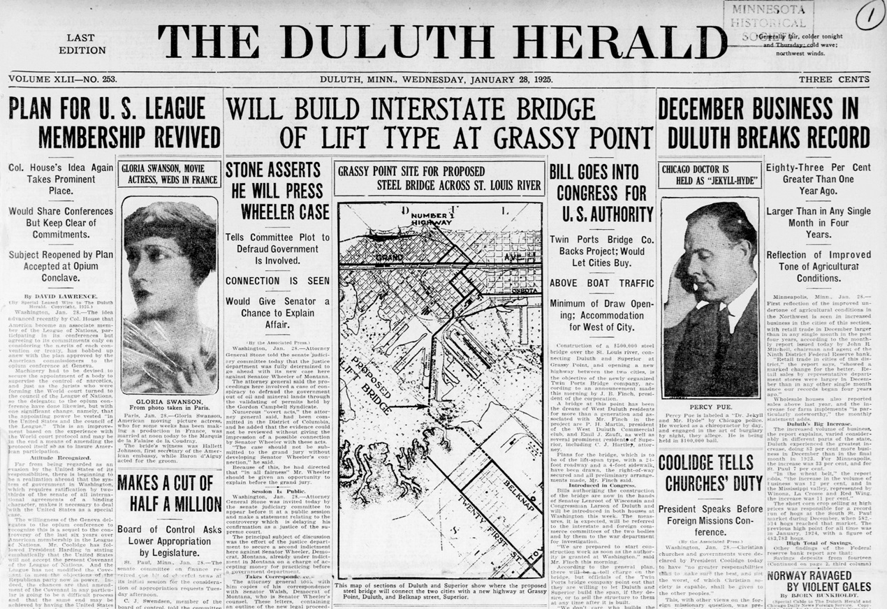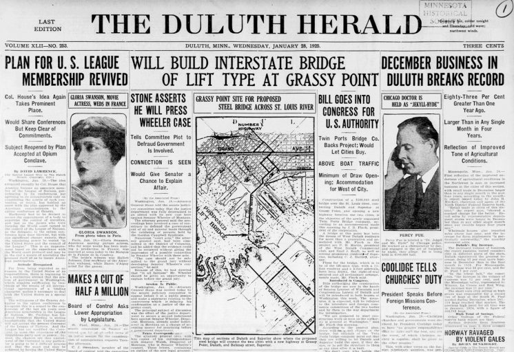 The Duluth Herald reported on the bridge plans on the front page of its Jan. 28, 1925 edition. At the time the plans called for a “lift bridge” similar in style to the Aerial Bridge, which at the time was not yet a lift bridge.