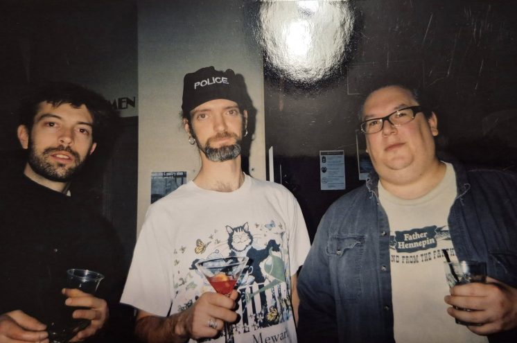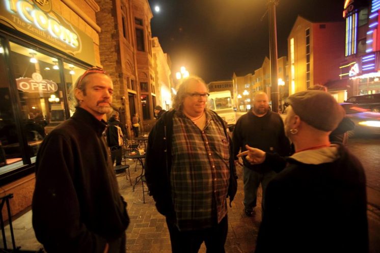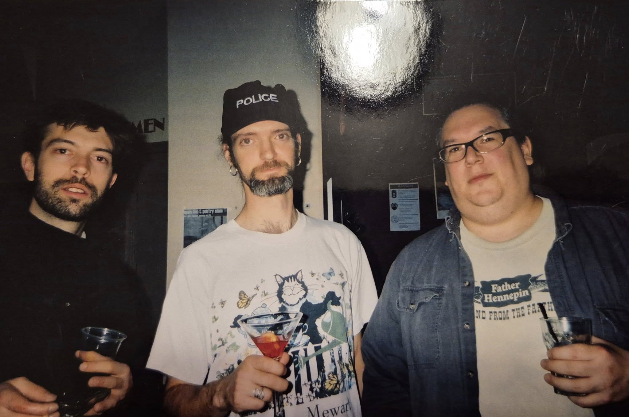I have just heard the news of his passing and I have no information about it. Lumpy was a beloved OG Duluth scenester and PDD personage. The top photo is from a chance meeting at Pizza Lucé; during our conversation he used the phrase “post-scarcity anarcho-syndicalist culture.” I think he was describing the Iain M. Banks novel Consider Phlebas, which he loaned me. The second pic is from Homegrown a few years ago (photo credit: I forget). The music had stopped at the end of the night and people poured into the street — a magic moment, the real party was just beginning. The third pic is from the 2004 era of the Gonzo Science musical at the Norshor, for which Lumpy (and Lefty, at left) worked on graphics (photo: Jill Hall).