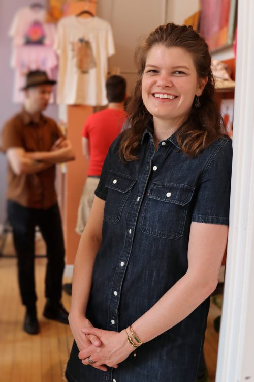 Breilein in the doorway of Hemlocks Leatherworks during her opening art reception. (Photo by Jess Morgan)