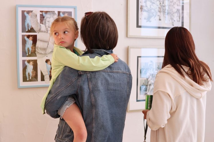 Alby’s parents viewing the art on display at Hemlocks Leatherworks on May 30. (Photo by Jess Morgan)