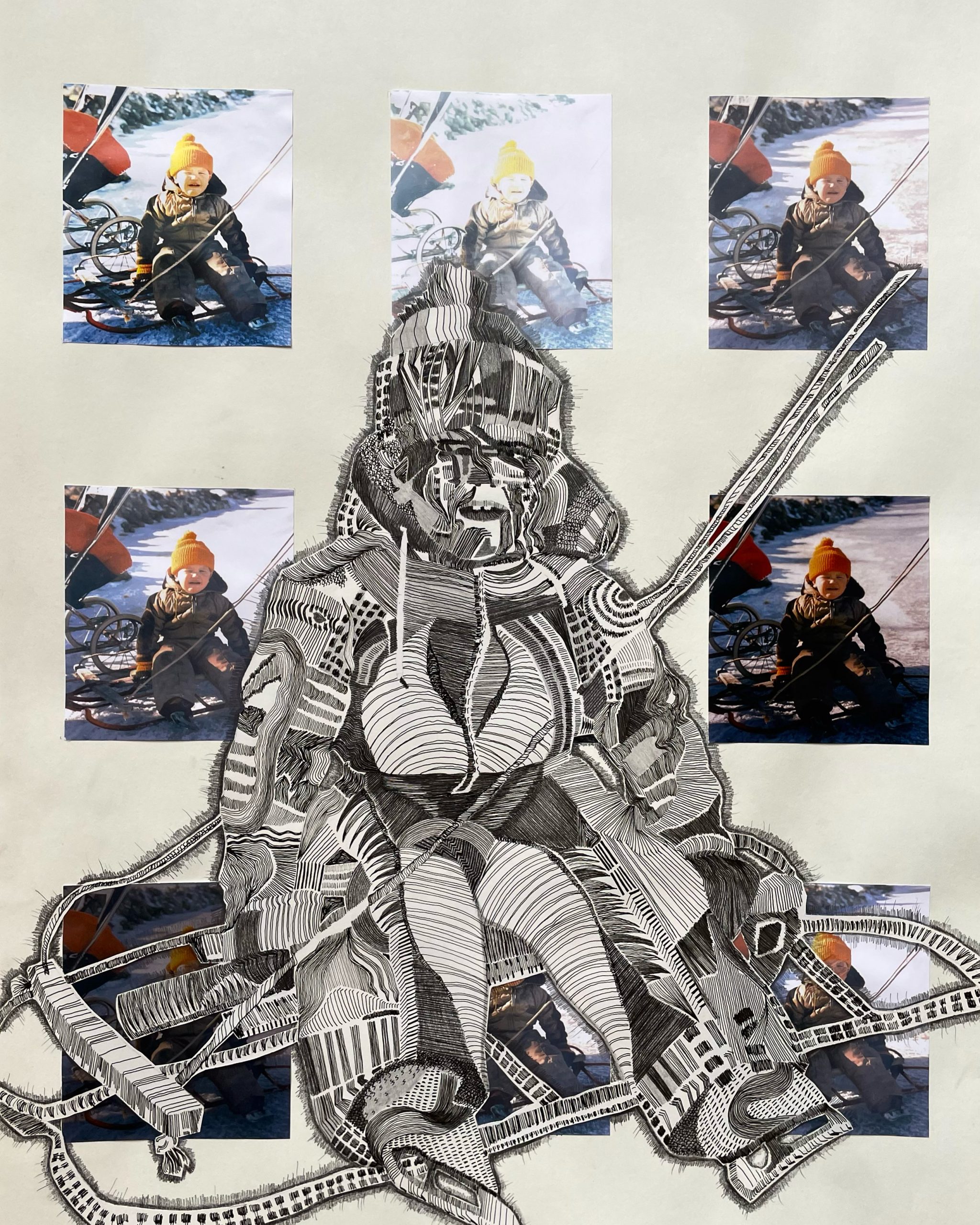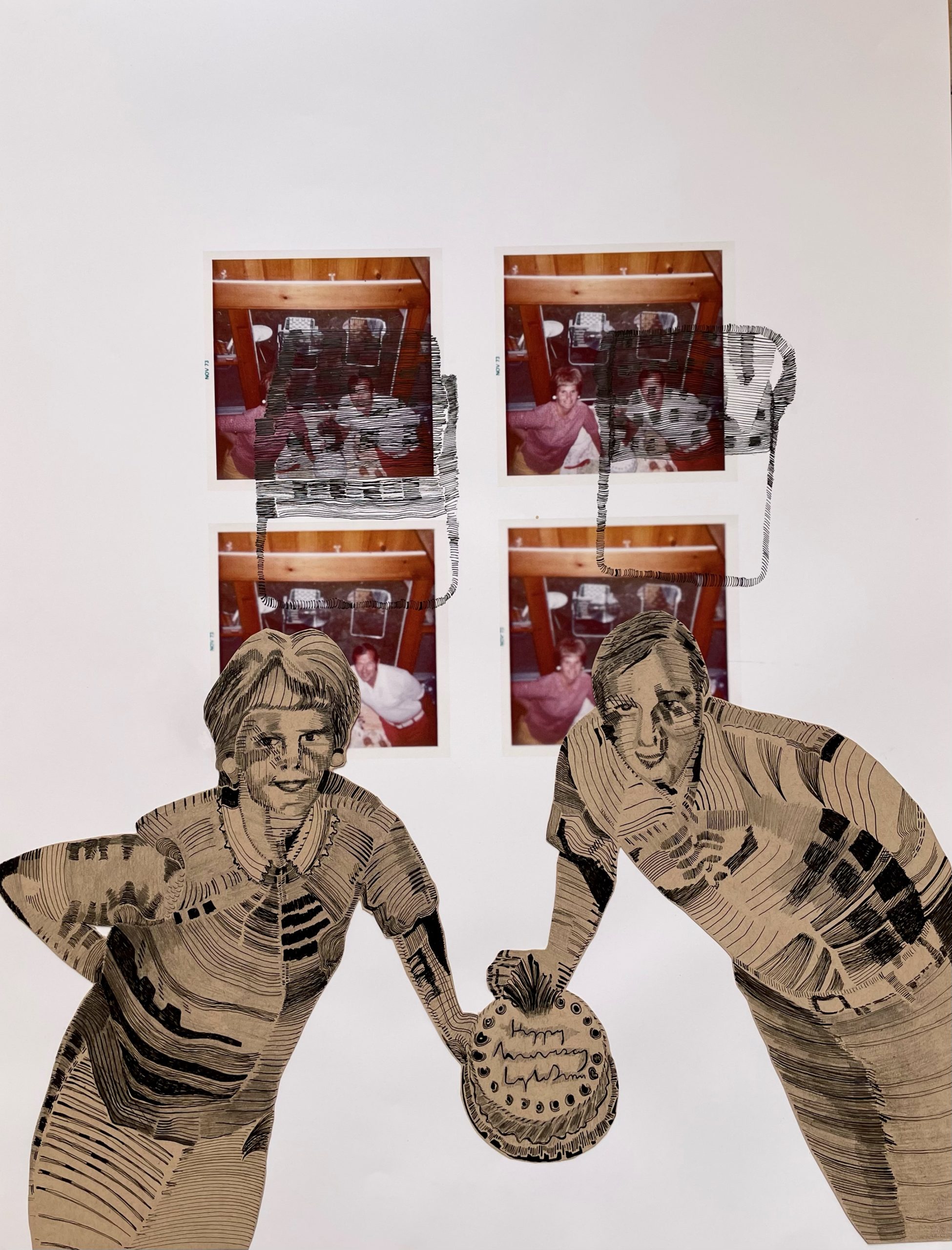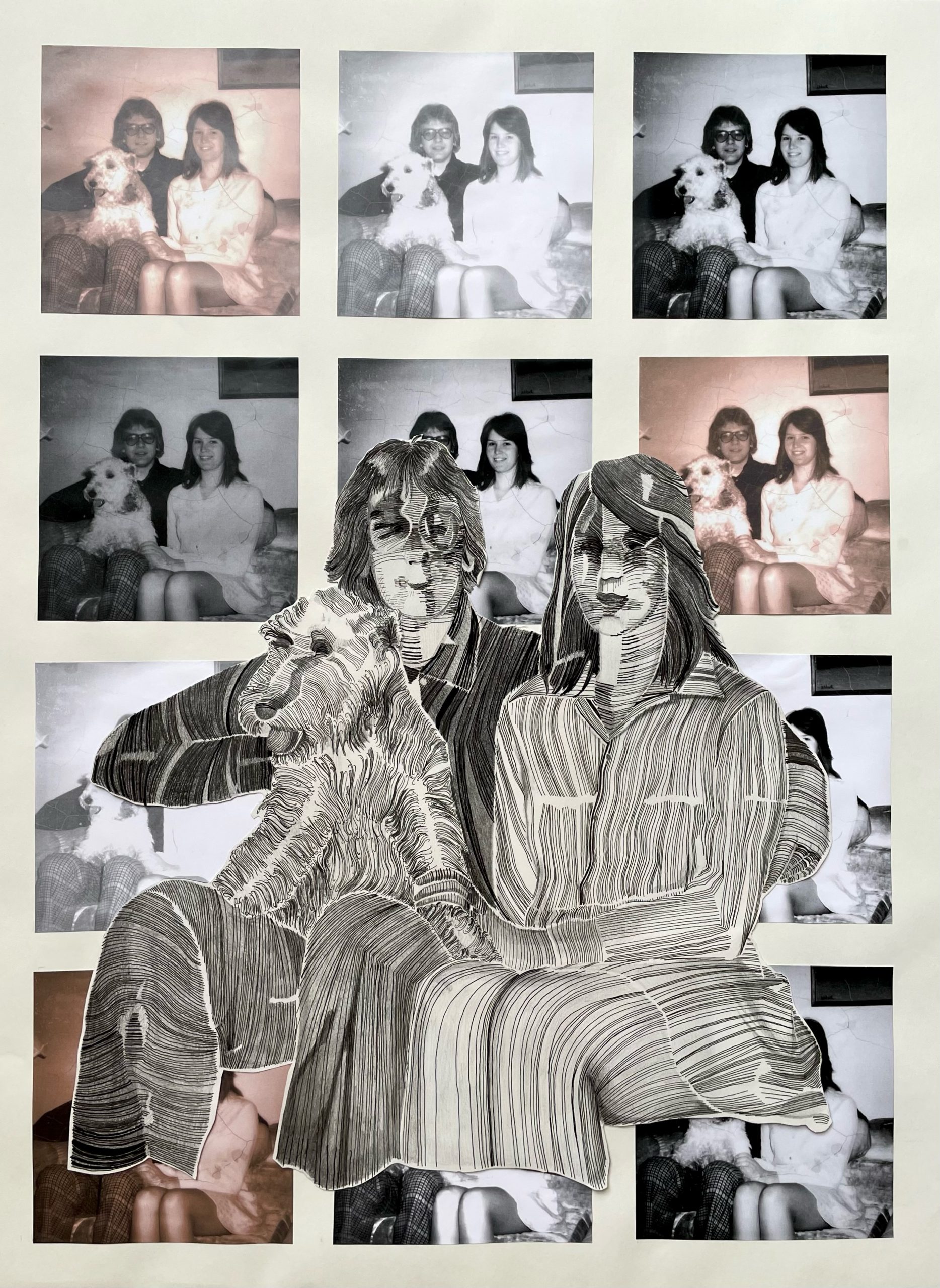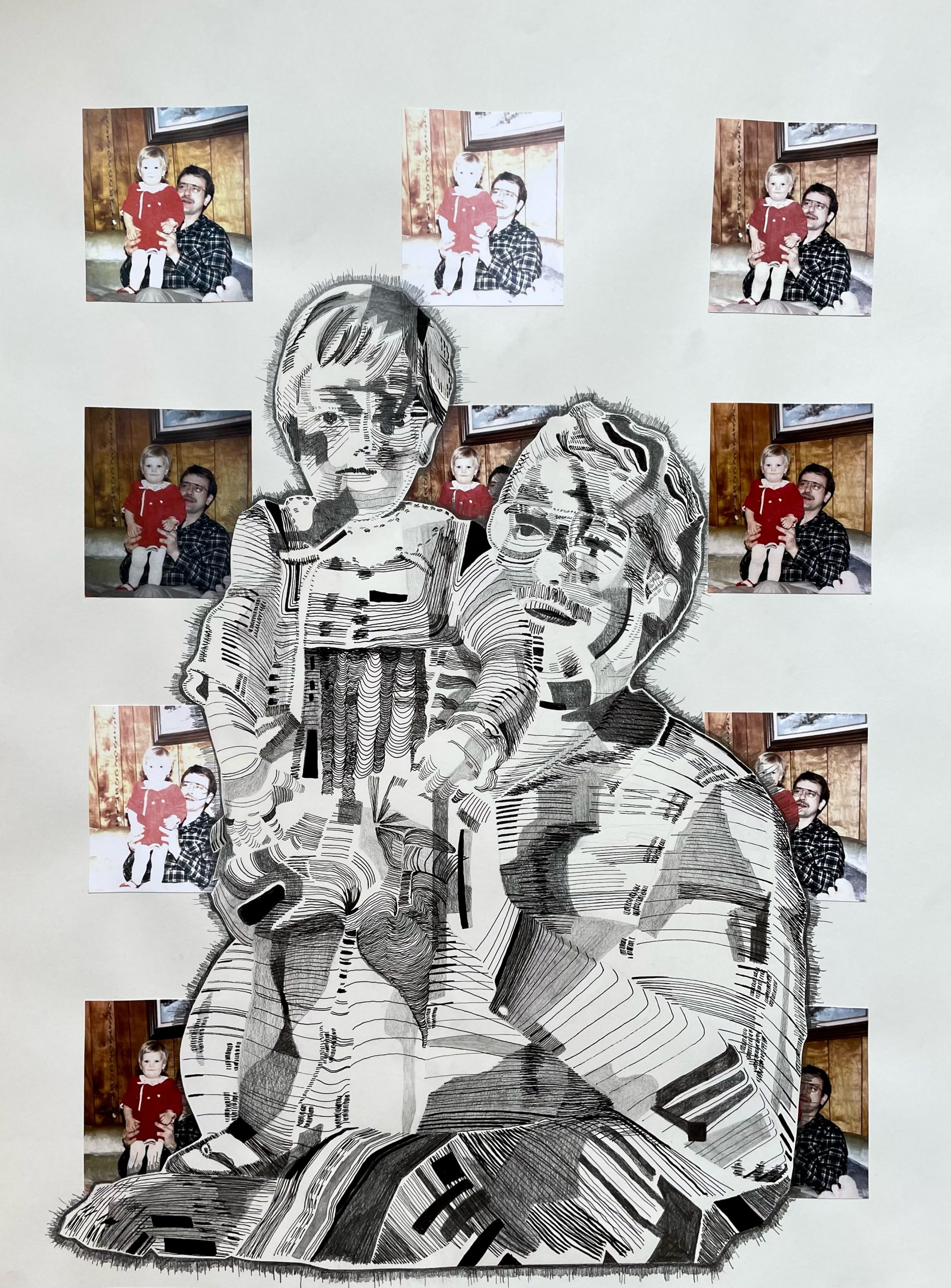 I have drawn from family photos with pencil and ink for about two years now. My mom and late grandma have given me dozens of family snapshots and some professional portraits, as well. Then I started thinking about the history of photography and the value of a photograph. I have photos of one set of my great, great grandparents and that’s probably the only one of them that was ever taken. There’s a lot of value in those photos, but also not a lot of information, because how much does one photo capture someone’s whole life? And where am I, a hundred plus years later, in the scheme of it? With that idea in mind, I began drawing family members from before I was born or before I could remember. The figures do not have recognizable features, and that’s where the idea of unknown family ancestry and personality comes in. Also, I’ve begun paying more attention to which photos I draw from. Photos with figures with jigsaw puzzle-like outlines or parts that protrude sharply are interesting to me, and more easy to recognize as limbs or hairdos. These outlines work, because one can identify that it’s a person or people, even without realistic shading and details inside.