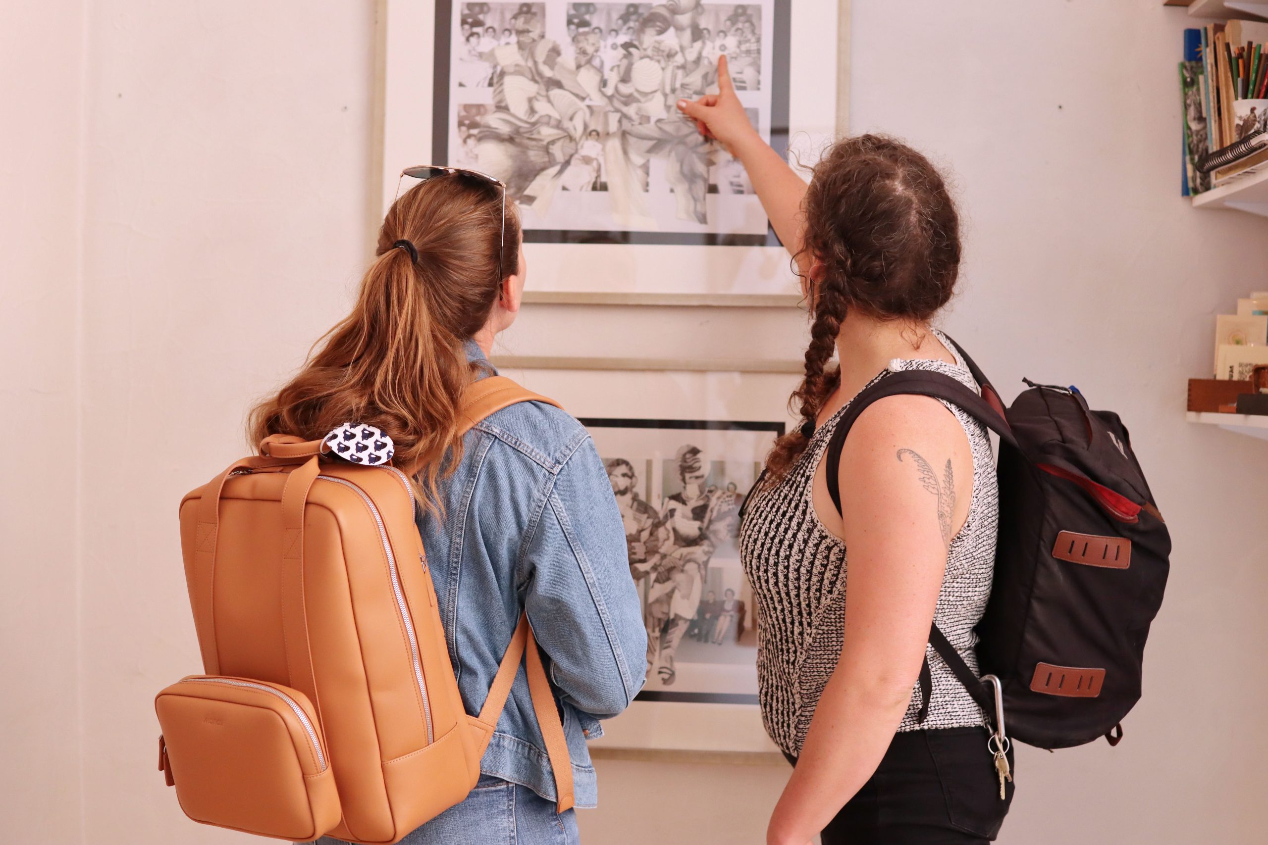 Alby’s parents viewing the art on display at Hemlocks Leatherworks on May 30. (Photo by Jess Morgan)