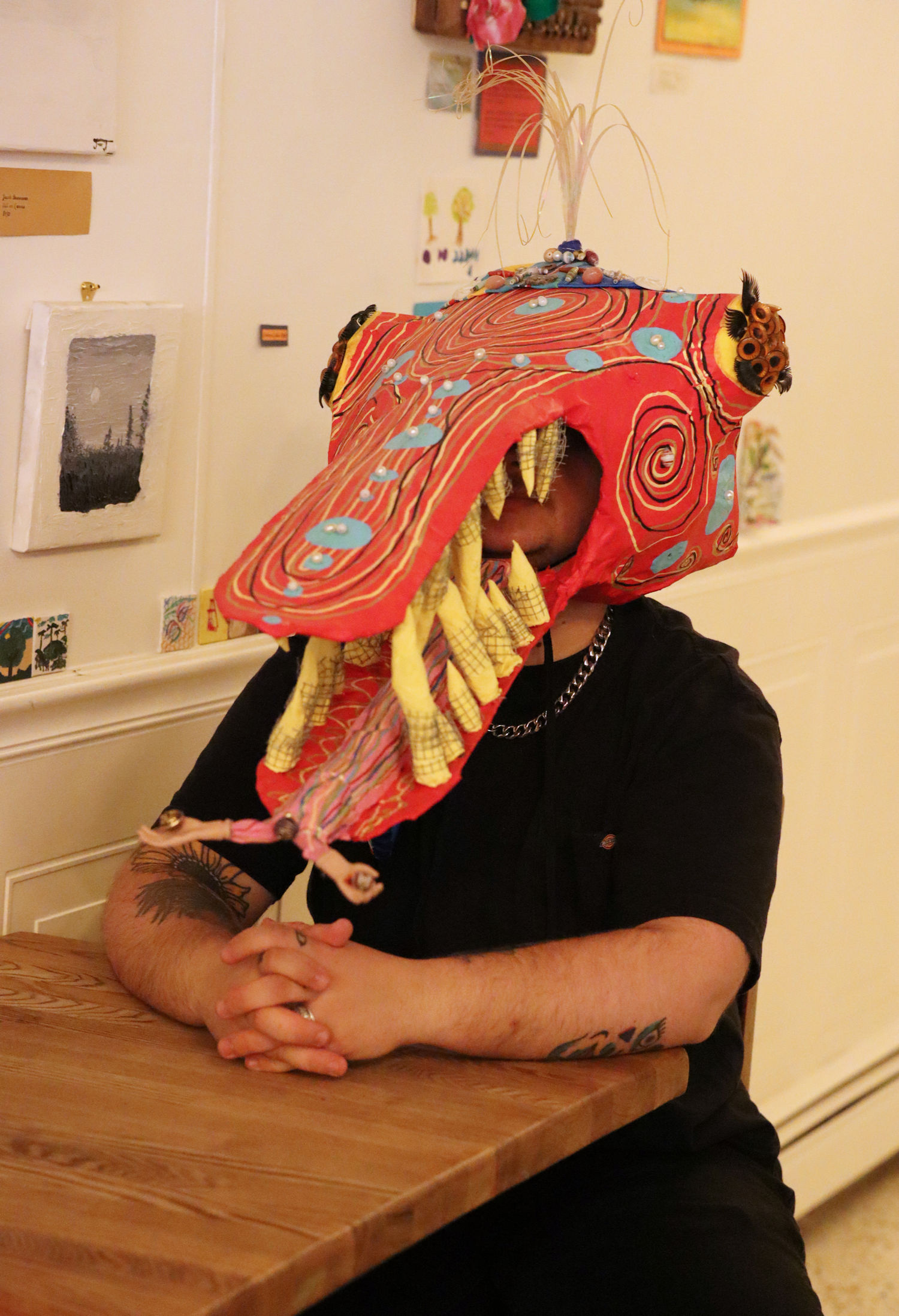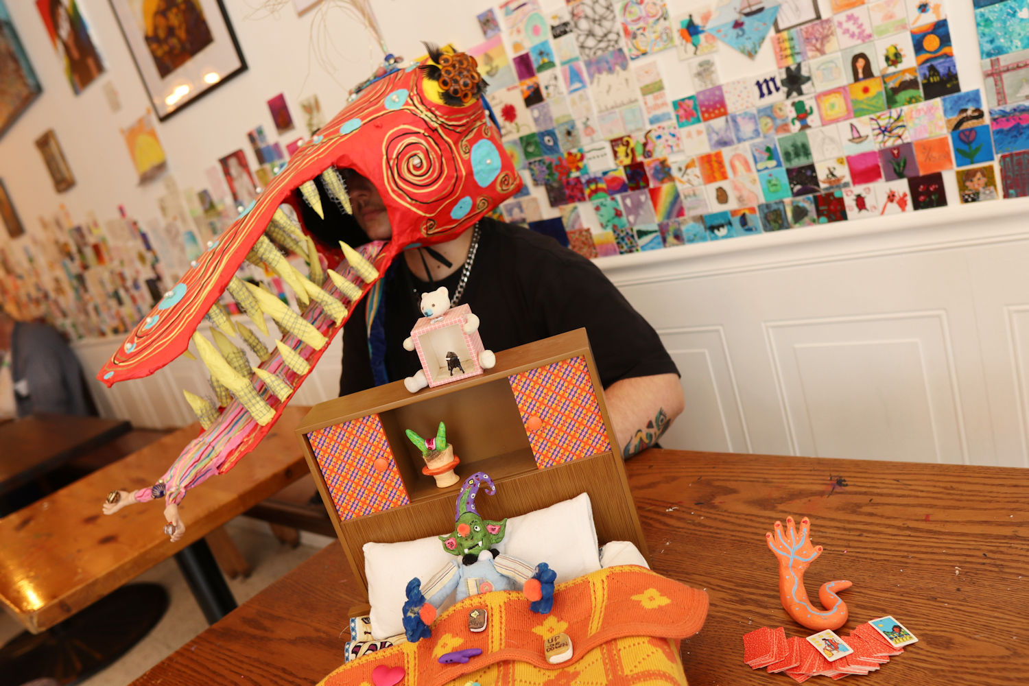 Atlas posing at Studio Cafe with one of his puppet heads. Photo by Jess Morgan.