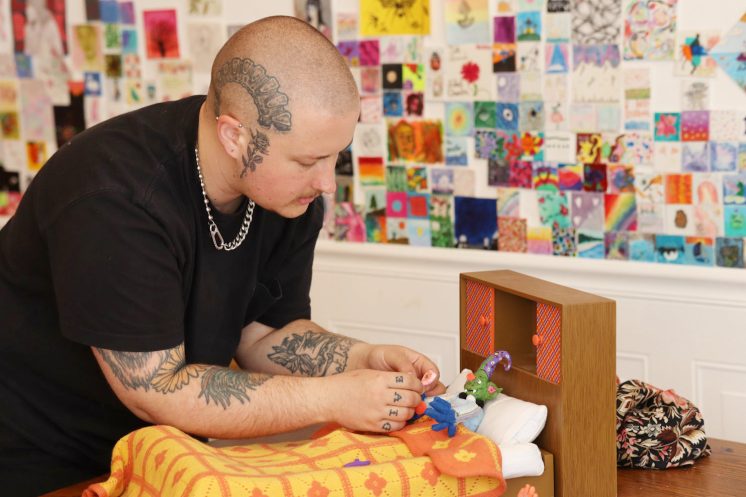 I’m not someone who has a hard time expressing myself or my opinions in the world. However, there’s something eerie and mystical that puppets allow me to fully step into another iteration of myself that I may not be able to just as Atlas. Going back to storytelling and poetry being the glue to this surreal world I am creating, I am the main character for the most part and creating a small or large-scale puppet allows me to fully step into that narrative I am trying to tell. With my costumes, I often use mostly clothes from my own closet to repurpose. My Syd the Scarecrow character has scraps of my grandparents’ flannels I used to wear and old Carhartt workpants I’ve worn while working in farms back down south. Masks, puppets and costuming are essential for me in storytelling.
