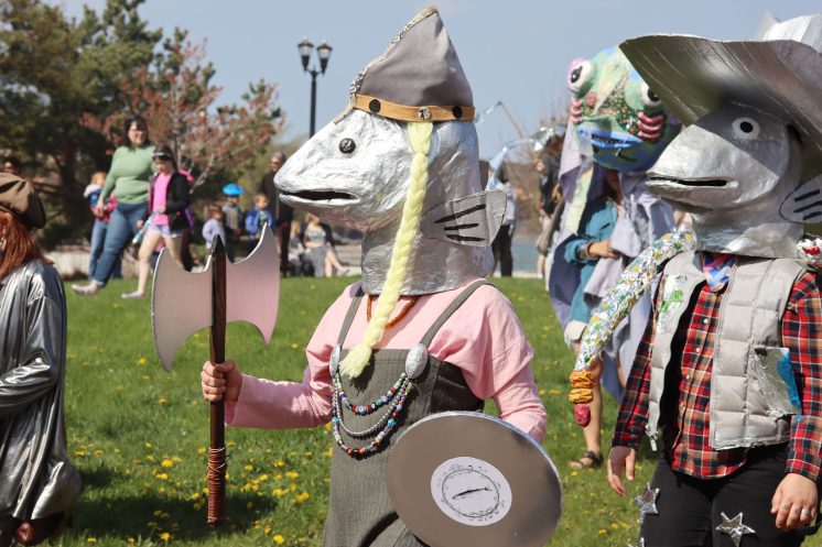 Smelt puppets roaming Canal Park at the annual smelt parade. The cowboy smelt (right) is a look worn and created by Atlas. Photo by Miro Zajchowski.