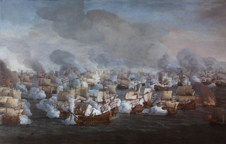 The Battle of Texel. A combined French and English force tries blockading Holland but a smaller Dutch force sends them packing, aided by the French and English hating each other. The French laugh it off and are even a little thrilled by the sheer Dutch competence; the English seethe about it: “The French are incapable of not getting drawn off into long chases while we get pounded in the center.” (Painting by Willem van de Velde I, 1673)