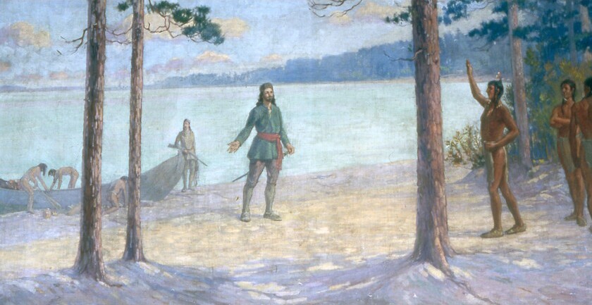 Duluth “discovers” Park Point. His mission from the French king: to steal the lucrative beaver pelt market from the English by convincing the Dakota and Ojibwe to trade with France instead. The mission is a success. He keeps hoping he might find the Pacific Ocean around here somewhere. That mission is not a success. (Painting by C.C. Rosenkrantz, 1919)
